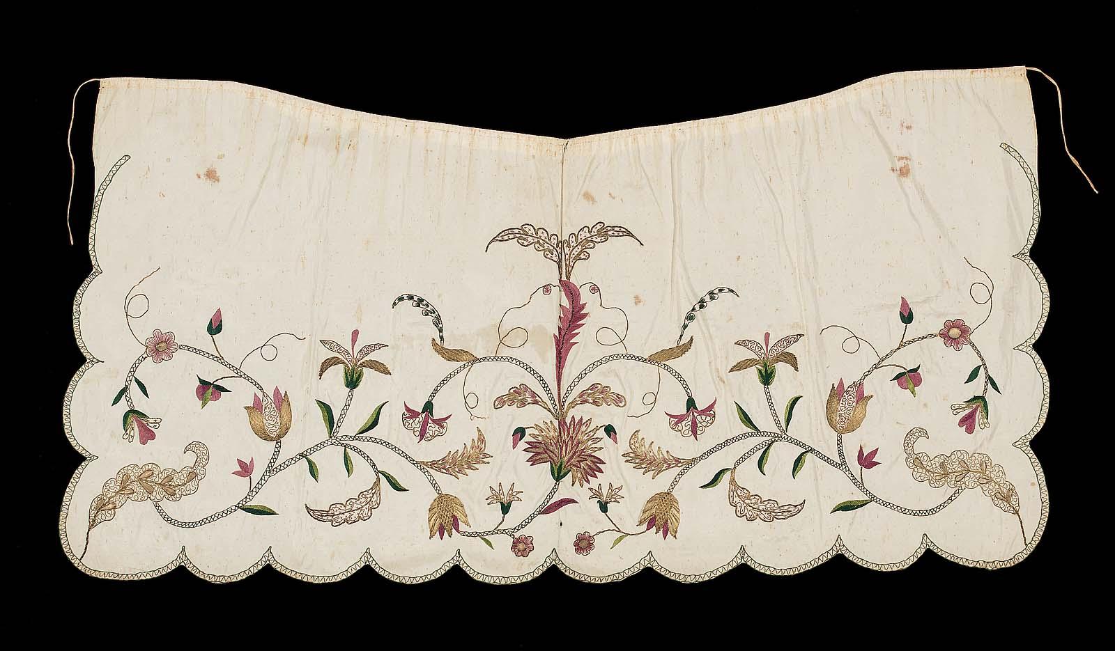 Apron English first half 18th century Object Place: England MEDIUM:TECHNIQUE Silk taffeta with silk and gold metal thread embroidery 53.243