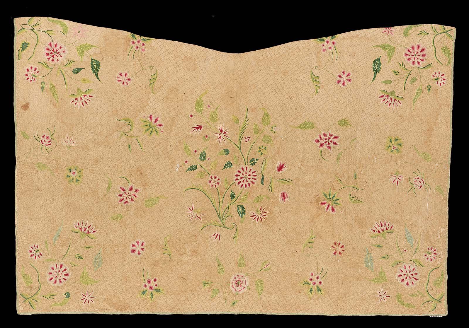 Quilted and embroidered apron English Early 18th century, Linen tabby quilted with silk chain stitch embroidery and silk tape binding MFA Boston, 53.520
